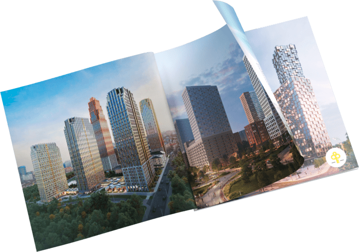 Это настоящий город в городе: пять корпусов соединены стилобатом, отведенном под собственную инфраструктуру, где расположены кофейни, рестораны, фитнес-центр, продуктовые магазины, центры бытовых услуг, коворкинг, медицинский центр, отделение банка, супермаркет и автомойка!